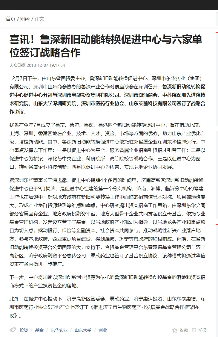大眾日?qǐng)?bào):喜訊!魯深新舊動(dòng)能轉(zhuǎn)換促進(jìn)中心與六家單位簽訂戰(zhàn)略合作